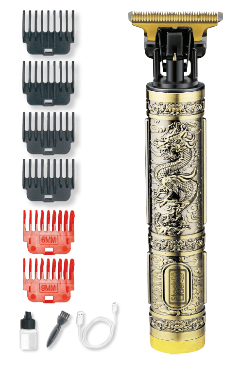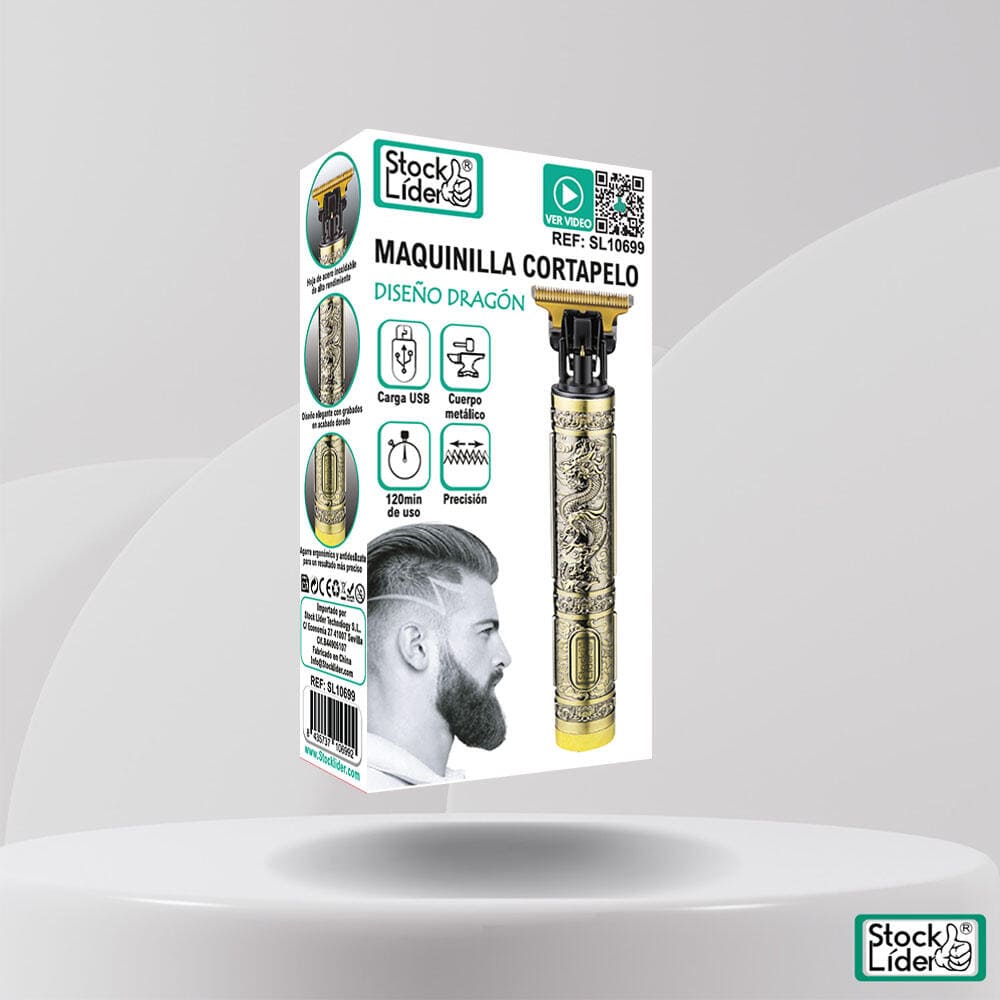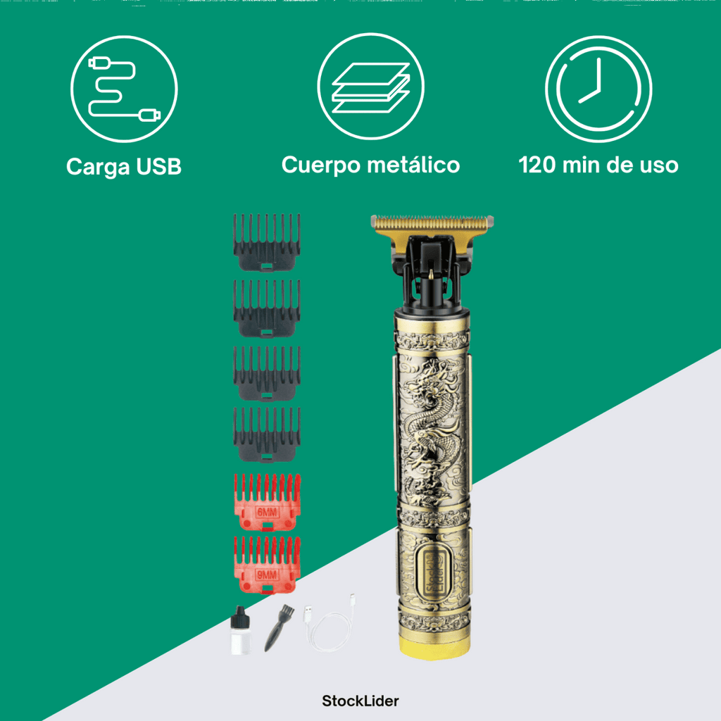 La Maquinilla Cortapelo Diseño Dragón es una herramienta profesional que combina potencia, precisión y estilo en un diseño único. Su cuerpo metálico con grabados en acabado dorado aporta un toque elegante y robusto, inspirado en la fuerza y majestuosidad del dragón.